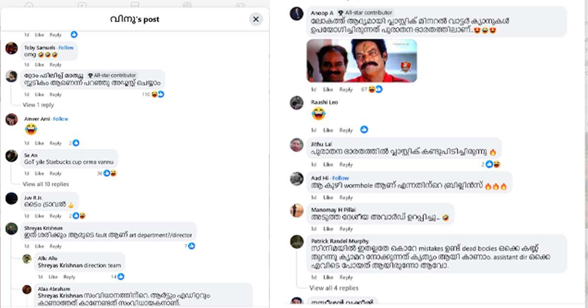 ‘പുരാതന ഭാരതത്തിലാണ് ആദ്യമായി പ്ലാസ്റ്റിക് കണ്ടുപിടിച്ചതെന്ന് ഇപ്പോള്‍ മനസിലായില്ലേ’, ‘കാന്താര ഫാന്റസി മാത്രമല്ല, ടൈം ട്രാവലും കൂടിയുള്ള സിനിമയാണ്’, ‘പ്ലാസ്റ്റിക്കല്ല, സ്ഫടികമാണെന്ന് പറഞ്ഞ് അഡ്ജസ്റ്റ് ചെയ്യാം’, ‘ശുദ്ധമായ ബിസ്‌ലെരി വെള്ളം കൊടുത്തത് തെറ്റാണോ’ എന്നിങ്ങനെ ചിരിപ്പിക്കുന്ന ധാരാളം കമന്റുകളുണ്ട്.