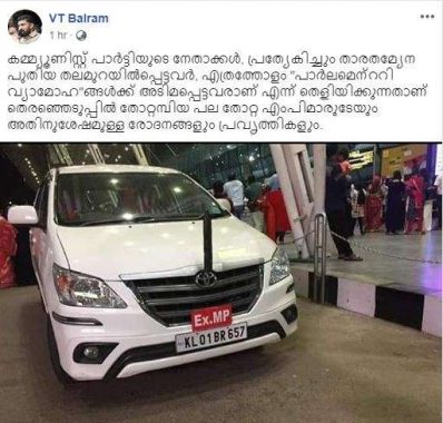 ‘കമ്മ്യൂണിസ്റ്റ് പാര്ട്ടിയുടെ നേതാക്കള്, പ്രത്യേകിച്ചും താരതമ്യേന പുതിയ തലമുറയില്പ്പെട്ടവര്, എത്രത്തോളം ‘പാര്ലമെന്ററി വ്യാമോഹ’ങ്ങള്ക്ക് അടിമപ്പെട്ടവരാണ് എന്ന് തെളിയിക്കുന്നതാണ് തെരഞ്ഞെടുപ്പില് തോറ്റമ്പിയ പല തോറ്റ എംപിമാരുടേയും അതിനുശേഷമുള്ള രോദനങ്ങളും പ്രവൃത്തികളും.’- എന്നായിരുന്നു ബല്റാം ഫേസ്ബുക്കില് കുറിച്ചത്. കാറിന്റെ ചിത്രവും പോസ്റ്റ് ചെയ്തിട്ടുണ്ട്.