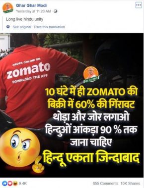 പത്ത് മണിക്കൂറിനുള്ളില് സൊമാറ്റോക്ക് കുറഞ്ഞത് 60% കച്ചവടം. കുറച്ചുകൂടി കഠിനപ്രയത്നം നടത്തിയാല് അത് 90% ആക്കാന് പറ്റും എന്നായിരുന്നു ഈ ചിത്രത്തില് ഉണ്ടായിരുന്നത്. 10000 ഷെയറും 9400 റിയാക്ഷനും ഉണ്ടായിരുന്നു ചിത്രത്തിന്.