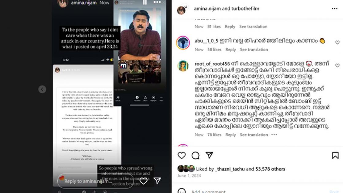 എന്നാല് ആമിന നിജമിന്റെ പോസ്റ്റുകള്ക്ക് താഴെ ഇതിനോടകം പല വിദ്വേഷ കമന്റുകളും വന്നുകഴിഞ്ഞു. ജിഹാദി എന്ന വിളിയും പാകിസ്ഥാനിലേക്ക് പോകാനുള്ള ആഹ്വാനവും കമന്റ് ബോക്സില് കാണാന് സാധിക്കുന്നുണ്ട്. ‘തീവ്രവാദികളെ കൊന്നപ്പോള് എന്തിനാണ് കരയുന്നത്? സ്വന്തം നാട്ടിലെ 26 പേരെ കൊന്നപ്പോള് ഇതൊന്നും കണ്ടില്ലല്ലോ’, ‘ഒരു ന്യൂസ് ഷെയര് ചെയ്യുമ്പോള് അതില് എത്രമാത്രം സത്യമുണ്ടെന്ന് അന്വേഷിക്കണ്ടേ’ എന്ന് തുടങ്ങി ഒരുപാട് കമന്റുകള് വരുന്നുണ്ട്.
