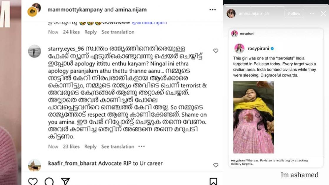 പഹല്ഗാം ഭീകരാക്രമണത്തിന് പകരമായി ഇന്ത്യന് ആര്മി നടത്തിയ ഓപ്പറേഷന് സിന്ദൂറില് പാകിസ്ഥാനിലെ സാധരണക്കാരും കൊല്ലപ്പെട്ടെന്ന വാര്ത്ത ആമിന തന്റെ ഇന്സ്റ്റഗ്രാമില് സ്റ്റോറിയായി ഇട്ടിരുന്നു. എന്നാല് ഇത് വ്യാജമാണെന്ന് തിരിച്ചറിഞ്ഞയുടന് ഡിലീറ്റാക്കുകയും ചെയ്തു. എന്നിരുന്നാലും ആമിനയുടെ പോസ്റ്റുകള്ക്ക് താഴെ അതിനോടകം പലരും വിമര്ശിച്ചുകൊണ്ട് കമന്റുകള് ഇടുകയാണ്.