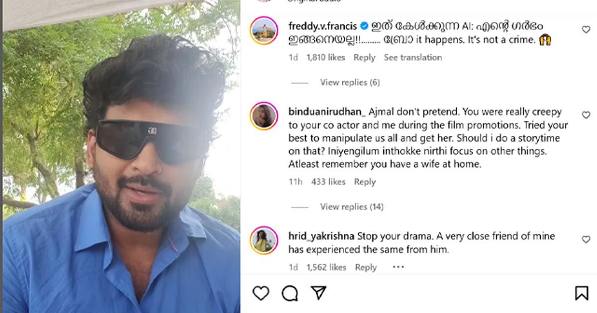 എന്നാല് കമന്റ് ബോക്സില് കൂടുതല് സ്ത്രീകള് അജ്മല് അമീറിനെതിരെ രംഗത്തെത്തി. തങ്ങളോടും മുമ്പ് മോശമായി പെരുമാറാന് ശ്രമിച്ചെന്നും ഇപ്പോള് നല്ലവനായി അഭിനയിക്കരുതെന്നുമാണ് പലരും കമന്റ് പങ്കുവെച്ചത്. ഹണ്ട് എന്ന സിനിമയുടെ ഷൂട്ടിനിടെ തന്നോട് ഫ്ളര്ട്ട് ചെയ്യുന്ന രീതിയില് മെസ്സേജുകളയച്ചിട്ടുണ്ടെന്നും പുറത്ത് പങ്കുവെക്കരുതെന്ന് ആവശ്യപ്പെട്ടിട്ടുണ്ടെന്നും ഒരാള് കമന്റ് ചെയ്തു. അന്നത്തെ ചാറ്റിന്റെ സ്ക്രീന് ഷോട്ടടക്കം തന്റെ കൈയിലുണ്ടെന്നും ഇവര് കമന്റ് ബോക്സില് കുറിച്ചു.