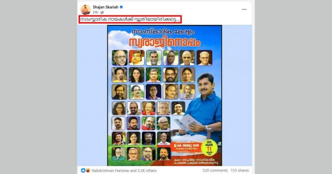 സംഘപരിവാര് അനുകൂല യുട്യൂബറും പ്രതിപക്ഷനേതാവിന്റെ വിരുന്നുകളിലെ സ്ഥിര സാന്നിധ്യവും നിരവധി കേസുകളില് അന്വേഷണം നേരിടുകയും ചെയ്യുന്ന ഷാജന് സ്കറിയയും എല്.ഡി.എഫിനെ പിന്തുണച്ച സാംസ്കാരിക പ്രവര്ത്തകരെ പരസ്യമായി അധിക്ഷേപിച്ചിട്ടുണ്ട്. എഴുത്തുകാരന് വൈശാഖന്, സംവിധായകന് കമല്, ടി.ഡി. രാമകൃഷ്ണന്, നിലമ്പൂര് ആയിഷ തുടങ്ങിയവരുടെ ചിത്രങ്ങല് പങ്കുവെച്ച് കൊണ്ടുള്ള പോസ്റ്റില് സാംസ്കാരിക നായകള്ക്ക് സ്തുതിയായിരിക്കട്ടെ എന്നാണ് ഷാജന് സ്കറിയ കുറിച്ചിരിക്കുന്നത്.