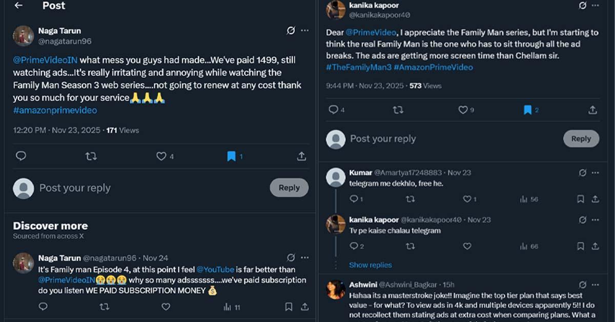 സബ്സ്ക്രിപ്ഷന് എടുത്തവര്ക്ക് പോലും സിനിമയോ സീരിസോ കാണുന്നതില് വലിയ തടസങ്ങള് നേരിടുന്നുണ്ട്. ഒരു സിനിമ കണ്ടുതീര്ക്കുമ്പോള് മിനിമം അരമണിക്കൂറെങ്കിലും പരസ്യങ്ങളുണ്ടാകുമെന്നാണ് വിമര്ശനം. ഏറ്റവുമൊടുവില് ആമസോണ് പ്രൈം പുറത്തിറക്കിയ ഫാമിലി മാന് മൂന്നാം സീസണും ഈ പ്രശ്നമുണ്ടെന്ന് പലരും ആരോപിക്കുന്നു.
