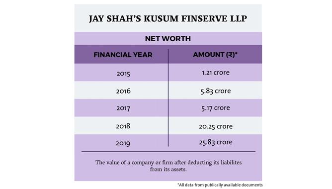 നരേന്ദ്ര മോദിയുടെ നേതൃത്വത്തിലുള്ള ബി.ജെ.പി സര്‍ക്കാര്‍ അധികാരത്തില്‍ വന്നതിനുശേഷം, 2015 നും 2019 നും ഇടയില്‍ ജയ് ഷായുടെ കുസും ഫിന്‍സെര്‍വിന്റെ മൊത്തം മൂല്യം 24.61 കോടി രൂപയായാണ് ഉയര്‍ന്നത്.