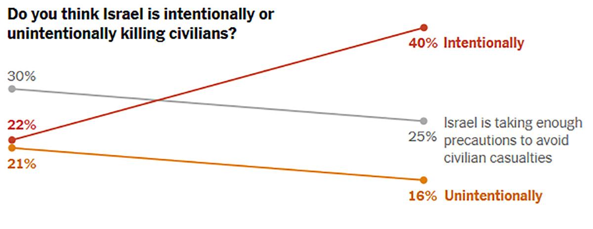 ഗസയിലെ സാധാരണക്കാരെ ഇസ്രഈല് കൊന്നൊടുക്കുന്നത് മനപ്പൂര്വമാണോ അല്ലയോ എന്ന ചോദ്യത്തിന് അവര് മനപ്പൂര്വം സാധാരണക്കാരെ കൊന്നൊടുക്കുന്നു എന്ന മറുപടിയാണ് 40 ശതമാനം ആളുകളും നല്കിയത്. 2023 ഡിസംബറില് 22 ശതമാനം മാത്രം ആളുകള്ക്ക് മാത്രമാണ് ഈ അഭിപ്രായമുണ്ടായിരുന്നത്.