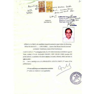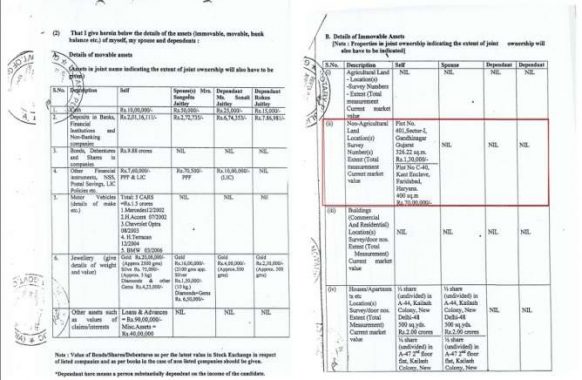 എന്നാൽ, ഇതേ സ്ഥലത്തിന്റെ കാര്യം കേന്ദ്ര ധനകാര്യ മന്ത്രി അരുൺ ജെയിറ്റ്ലിയുടെ തെരഞ്ഞെടുപ്പ് സത്യവാങ്മൂലത്തിലും പരാമർശിക്കുന്നുണ്ട്. 2006ൽ ജെയിറ്റ്ലി സമർപ്പിച്ച തെരഞ്ഞെടുപ്പ് സത്യവാങ്മൂലത്തിൽ താൻ മാത്രമാണ് ഗാന്ധിനഗറിൽ സെക്ടർ ഒന്നിലുള്ള പ്ലോട്ട് 401ന്റെ ഉടമ എന്നാണ് കാണിച്ചിരിക്കുന്നത്. എന്നാൽ ഇക്കാര്യം പിന്നീടുള്ള സത്യവാങ്മൂലങ്ങളിൽ അദ്ദേഹം പറഞ്ഞിട്ടുമില്ല. ഈ ഭൂമി തനിക്ക് ലഭിച്ചത് ഒരു തഹസിൽദാർ വഴിയാണ് എന്നാണ് അരുൺ ജെയിറ്റ്ലി തന്റെ ഔദ്യോഗിക സർക്കാർ വെബ്സൈറ്റിൽ പറഞ്ഞിട്ടുള്ളത്. ലഭിച്ച വിവരമനുസരിച്ച് അരുൺ ജെയിറ്റ്ലി തന്നെയാണ് സ്ഥലത്തിന്റെ ഇപ്പോഴത്തെ ഉടമ.