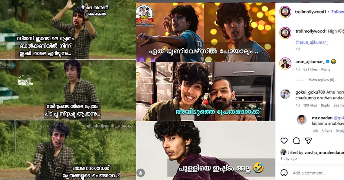 ‘പ്രേതങ്ങളുടെ സ്ഥിരം ചെണ്ട, എവിടെപ്പോയാലും സ്വസ്ഥത തരാത്ത പ്രേതങ്ങള്’, ‘ഏത് യൂണിവേഴ്സില് പോയാലും അവിടത്തെ പ്രേതങ്ങള്ക്ക് പുള്ളിയെ ഇഷ്ടമല്ല’ എന്നിങ്ങനെ പറഞ്ഞുകൊണ്ടുള്ള പോസ്റ്റുകള് വൈറലായിരിക്കുകയാണ്. ഈ ട്രോളുകള്ക്ക് ലഭിക്കുന്ന കമന്റുകളും രസകരമാണ്. ‘ഞാനേ, ഭയങ്കര ഹൈയായി പോയി’ എന്ന സര്വം മായയിലെ ഡയലോഗ് എല്ലാവരെയും ചിരിപ്പിക്കുന്നുണ്ട്.