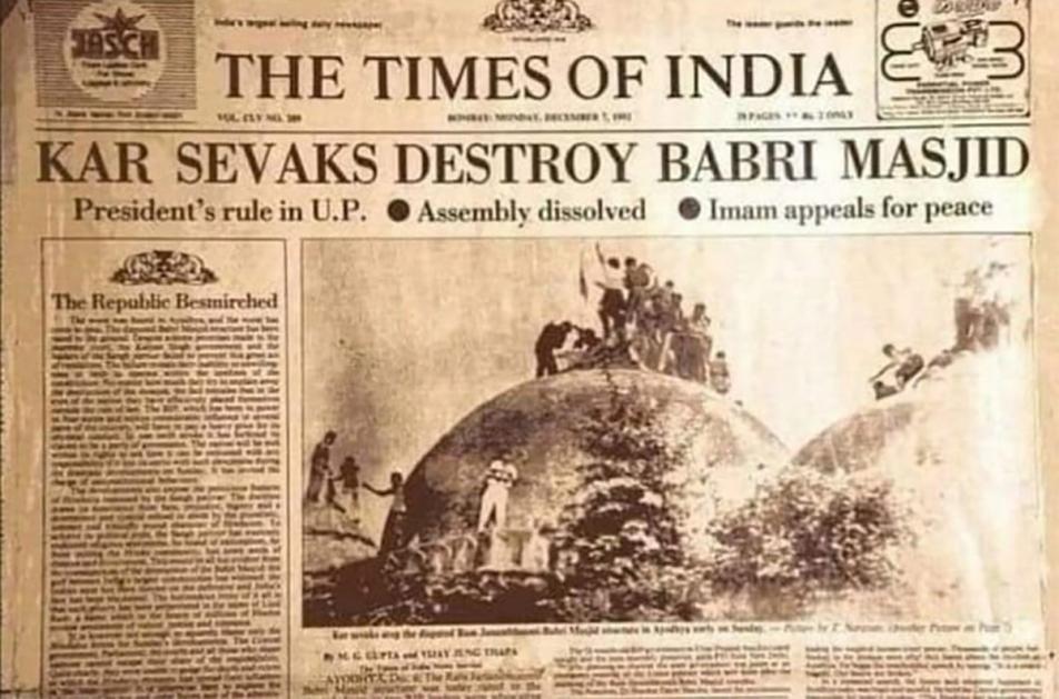 ബാബരി മസ്ജിദ് ധ്വംസനത്തെ കുറിച്ചുള്ള ടൈംസ് ഓഫ് ഇന്ത്യയുടെ പത്രവാര്ത്ത