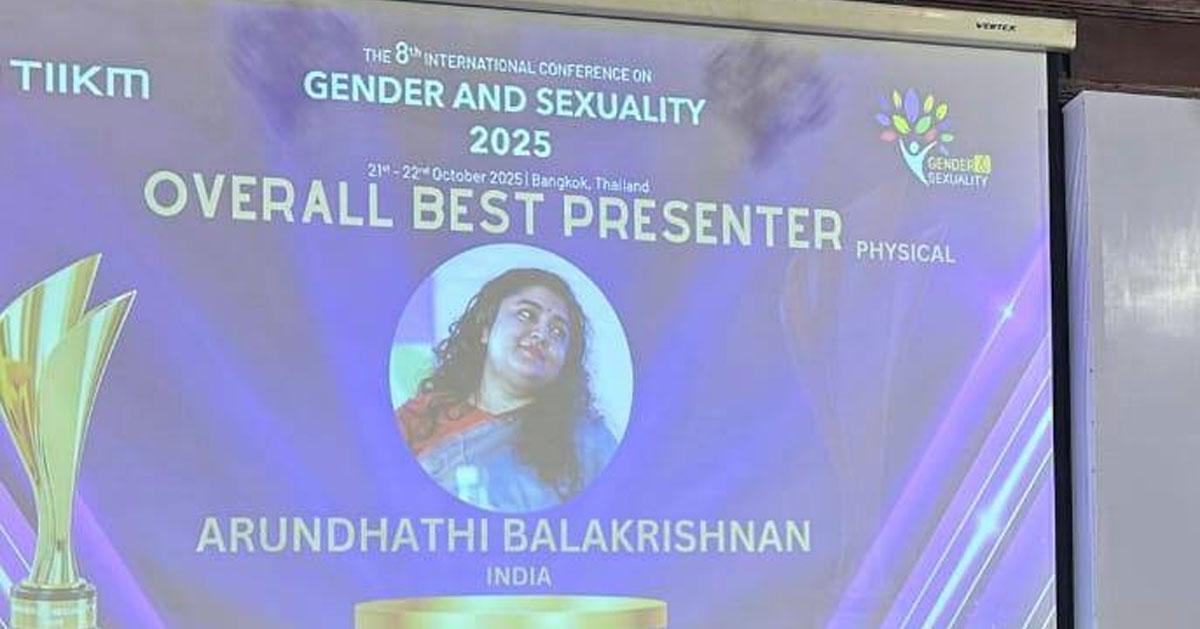 ബാങ്കോക്ക്: തായ്‌ലൻഡിൽ നടന്ന എട്ടാമത് ടി.ഐ.ഐ.കെ.എം (TIIKM) സമ്മേളനത്തില്‍ ഓവറോള്‍ ബെസ്റ്റ് പെര്‍ഫോമറായി അരുന്ധതി ബി. ഫലസ്തീന്‍ വിഷയത്തില്‍ പ്രബന്ധം അവതരിപ്പിച്ചാണ് അരുന്ധതി ഈ നേട്ടം കൈവരിച്ചത്.