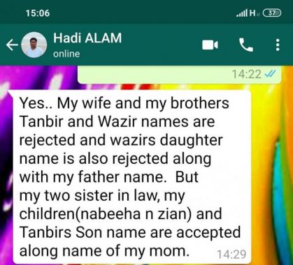 തന്വീറിന്റെയും വസീറിന്റെയും ഭാര്യമാരുടെയും മക്കളുടെയും പേരുകള് ലിസ്റ്റില് ഉണ്ട്, അത് നിങ്ങള്ക്ക് കണ്ടാല് മനസ്സിലാകും.