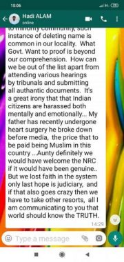 എല്ലാവരും പരിഭ്രമിച്ചു ഓട്ടത്തിലാണ്. ലിസ്റ്റില് പല കൃത്രിമങ്ങളും നടന്നതായി പറഞ്ഞു കേള്ക്കുന്നു. ഇന്ത്യയില് മുസ്ലീമായി ജീവിക്കുന്നതിന് കൊടുക്കേണ്ടി വന്ന വിലയാണ്. വാപ്പാക്ക് ഈയിടെ ഹൃദയസംബന്ധമായ ഒരു സര്ജറി കഴിഞ്ഞതേയുള്ളൂ. കഴിഞ്ഞ ദിവസം വാപ്പ മാധ്യമങ്ങളുടെ മുന്നില് പൊട്ടിക്കരഞ്ഞു. സത്യം ലോകത്തെ അറിയിക്കണം. അതിനാണ് നിങ്ങള്ക്ക് ഈ മെസ്സേജുകള് അയക്കുന്നത് ‘
