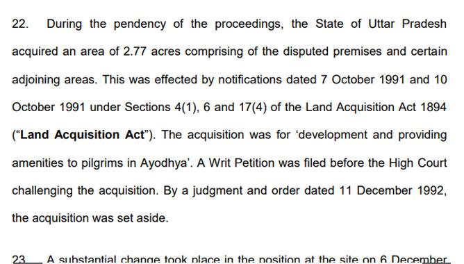 ഈ ഏറ്റെടുക്കലിനെതിരെ അലഹബാദ് ഹൈക്കോടതിയില് ഒരു റിട്ട് ഹര്ജി ഫയല് ചെയ്തിരുന്നു. എന്നാല് ബാബ്റി പള്ളി പൊളിച്ച് അഞ്ച് ദിവസത്തിന് ശേഷം 1992 ഡിസംബര് 11 ന് വന്ന വിധിന്യായത്തില് ഈ ഹരജി മാറ്റിവെച്ചു.