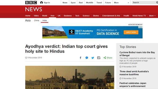 ‘അയോധ്യ വിധി: വിശുദ്ധ ഭൂമി ഹിന്ദുക്കള്ക്ക് നല്കി ഇന്ത്യന് പരമോന്നത കോടതി’ എന്നായിരുന്നു ബി.ബി.സി വാര്ത്തയുടെ തലക്കെട്ട്. അയോധ്യ വിധിയില് അമിത വൈകാരിക പ്രകടനങ്ങള് പാടില്ലെന്ന കര്ശന നിര്ദ്ദേശം നിലനില്ക്കെ തന്നെ താന് ജയ് ശ്രീറാം വിളികള് കേട്ടിരുന്നുവെന്ന് കോടതിയില് വിധി റിപ്പോര്ട്ട് ചെയ്യാനെത്തിയ തങ്ങളുടെ പ്രതിനിധി പറഞ്ഞുവെന്നും ബി.ബി.സി വാര്ത്തയില് പറയുന്നു.