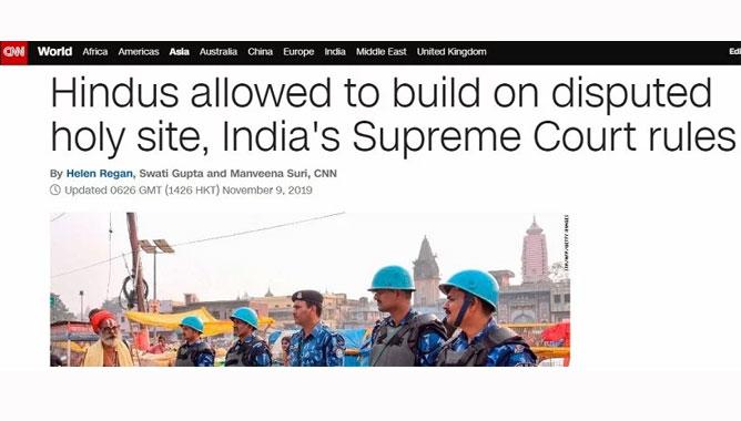 ‘തര്ക്കഭൂമിയില് നിര്മ്മാണം നടത്താന് ഹിന്ദുക്കള്ക്ക് അനുമതി’ എന്ന തലക്കെട്ടിലാണ് സി.എന്.എന് വാര്ത്ത റിപ്പോര്ട്ട് ചെയ്തത്. 1992 ല് തീവ്ര വലതുപക്ഷക്കാര് തകര്ത്ത പള്ളി നിലനിന്നിരുന്ന സ്ഥലത്ത് രാമക്ഷേത്രം നിര്മ്മിക്കാന് കോടതി അനുമതി കൊടുത്തുവെന്നും സി.എന്.എന് വാര്ത്തക്കുള്ളില് പറയുന്നു.