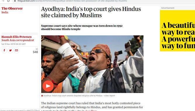 ‘മുസ്ലിങ്ങള് തര്ക്കിച്ച ഭൂമിയില് ഹിന്ദുക്കള്ക്ക് വിജയം’ എന്ന തലക്കെട്ടിലാണ് ദി ഗാര്ഡിയന് അയോധ്യവിധി റിപ്പോര്ട്ട് ചെയ്തത്. ഹിന്ദുദൈവമായ രാമന്റെ ജന്മസ്ഥലമെന്ന വിശ്വാസപ്രകാരം ഭൂമി ഹിന്ദുക്കള്ക്ക് അവകാശപ്പെട്ടതാണെന്ന് കോടതി നിരീക്ഷിച്ചു. എന്നാല് 16-ാം നൂറ്റാണ്ട് മുതല് ആ ഭൂമിയില് പള്ളിയുണ്ടായിരുന്നെന്നും ഒഴിഞ്ഞ ഭൂമിയിലായിരുന്നില്ലെന്ന പള്ളി നിര്മ്മാണമെന്നും കോടതി വിധിയില് പറയുന്നുണ്ടെന്നും ഗാര്ഡിയന് റിപ്പോര്ട്ട് ചെയ്യുന്നു.