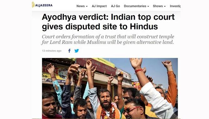 ‘തര്ക്കഭൂമി ഹിന്ദുക്കള്ക്ക് നല്കി ഇന്ത്യന് പരമോന്നത കോടതി വിധി’യെന്നാണ് അല് ജസീറ റിപ്പോര്ട്ട് ചെയ്തത്.