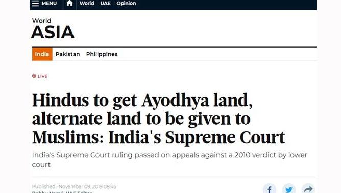 ‘അയോധ്യാ ഭൂമി ഹിന്ദുക്കള്ക്ക്, മുസ്ലീങ്ങള്ക്ക് പകരം ഭൂമി’ എന്ന തലക്കെട്ടിലാണ് ഗള്ഫ് ന്യൂസ് വാര്ത്ത റിപ്പോര്ട്ട് ചെയ്തത്.