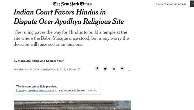 ‘അയോധ്യാ തര്ക്കഭൂമിയില് ഹിന്ദുക്കളുടെ താല്പ്പര്യത്തിനൊപ്പം നിന്ന് ഇന്ത്യന് കോടതി’ എന്ന തലക്കെട്ടിലാണ് ന്യൂയോര്ക്ക് ടൈംസ് വാര്ത്ത നല്കിയത്. മുസ്ലിങ്ങള് കൂടി അവകാശവാദമുന്നയിച്ച ഭൂമിയില് ഹിന്ദുക്കള്ക്ക് ഉടമസ്ഥാവകാശം നല്കി ഇന്ത്യന് പരമോന്നത കോടതിയുടെ വിധിയെന്നാണ് ന്യൂയോര്ക്ക് ടൈംസിന്റെ റിപ്പോര്ട്ടിനുള്ളില് വിശദീകരിക്കുന്നത്.