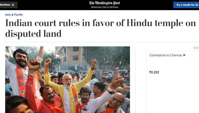 ‘തര്ക്കഭൂമിയില് ഹിന്ദുക്ഷേത്രത്തിന് അനുകൂലമായി ഇന്ത്യന് കോടതി വിധി’യെന്നായിരുന്നു ദി വാഷിംഗ്ടണ് പോസ്റ്റിന്റെ തലക്കെട്ട്. ഉചിതമായ സ്ഥലത്ത് മസ്ജിദ് നിര്മ്മിക്കാനായി മുസ്ലിങ്ങള്ക്ക് അഞ്ചേക്കര് ഭൂമി അഞ്ചംഗ കോടതി ബെഞ്ച് അനുവദിച്ചെന്നും രാമന്റെ പേരിലുള്ള ക്ഷേത്രം തര്ക്കഭൂമിയില് നിര്മ്മിക്കാന് ട്രസ്റ്റിന് അനുവാദം നല്കിയെന്നും വാഷിംഗ്ടണ് പോസ്റ്റിന്റെ വാര്ത്തയില് പറയുന്നു.