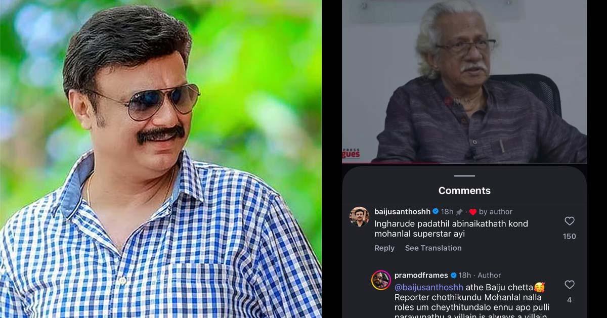 മോഹന്ലാല് നല്ലവനായ റൗഡിയാണെന്നും അയാള് തന്റെ സിനിമക്ക് ചേരില്ലെന്നും അടൂര് ഗോപാലകൃഷ്ണന് പണ്ട് അഭിമുഖത്തില് പറഞ്ഞ വീഡിയോക്ക് കമന്റുമായി നടന് ബൈജു സന്തോഷ്. ഇന്സ്റ്റഗ്രാമില് പ്രമോദ് ഫ്രെയിംസ് എന്ന പേജ് പോസ്റ്റ് ചെയ്ത വീഡിയോക്ക് ബൈജു പങ്കുവെച്ച കമന്റാണ് സോഷ്യല് മീഡിയയിലെ ചര്ച്ചാവിഷയം.