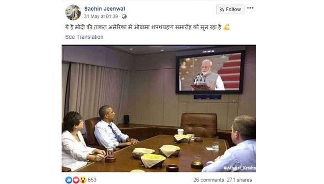 ‘ അമേരിക്കയിലിരുന്ന് ഒബാമ പോലും മോദിയുടെ സത്യപ്രതിജ്ഞാ ചടങ്ങ് വീക്ഷിക്കുന്നു. ഇതാണ് മോദിയുടെ ശക്തി’ എന്ന കുറിപ്പോടെയായിരുന്നു ചിത്രം പോസ്റ്റ് ചെയ്തിരുന്നത്.