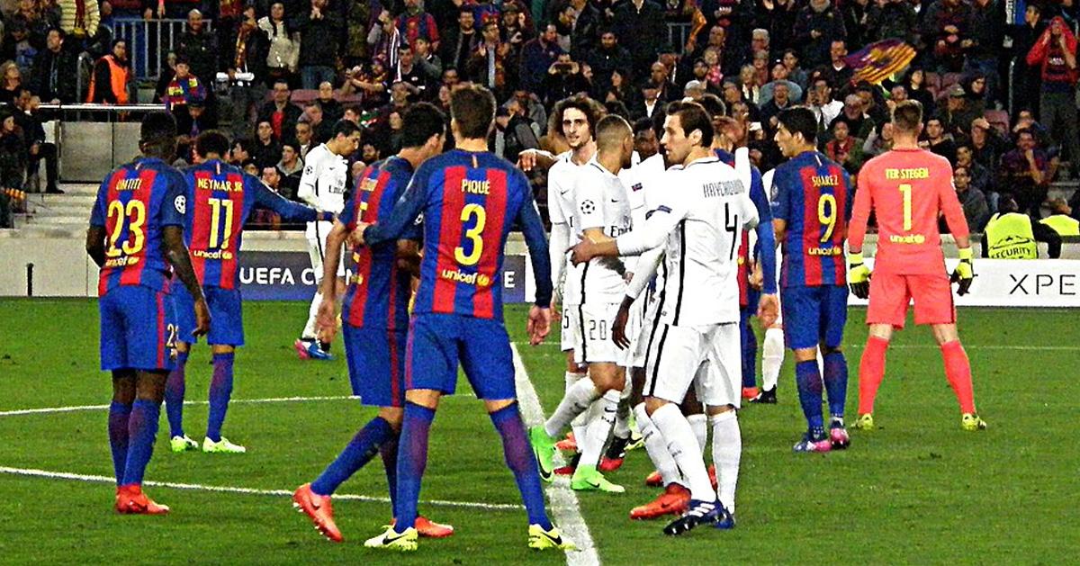 ബാഴ്സലോണയും പി.എസ്.ജിയും 2017 യുവേഫ ചാമ്പ്യന്സ് ലീഗ് നോക്ക് ഔട്ട് മത്സരത്തിനിടെ. Photo: Wikipedia.com