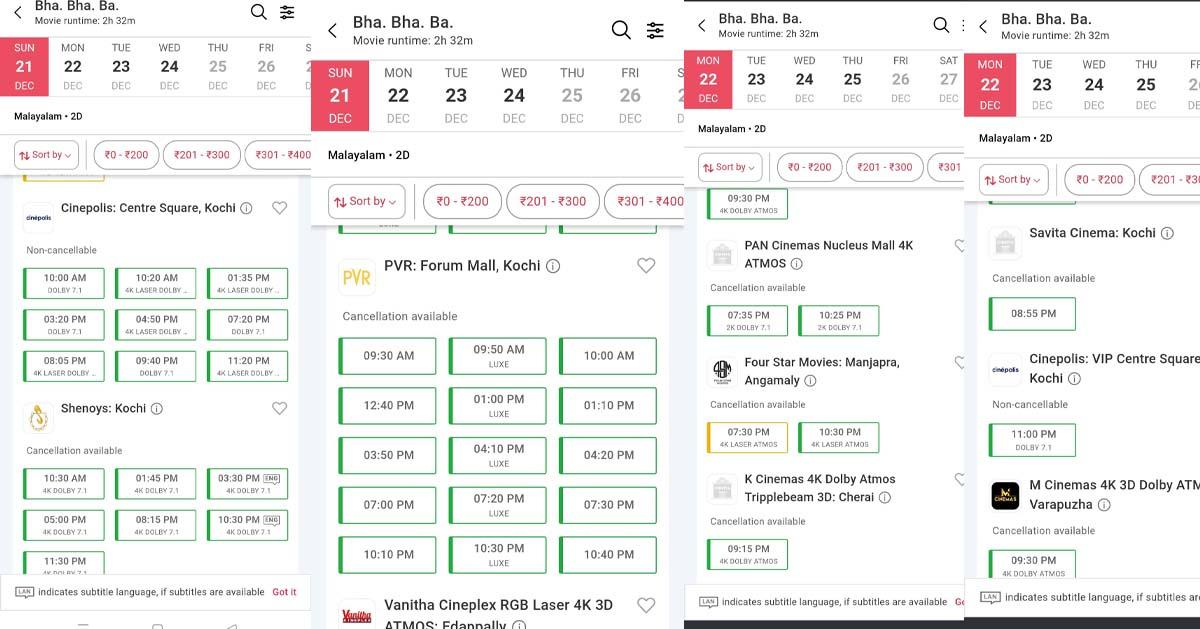 കേരളത്തിലെ മെട്രോ നഗരമായ കൊച്ചിയിലും ചിത്രത്തിന്റെ ബുക്കിങ് പരിതാപകരമാണ്. 100ലധികം ഷോയുള്ള കൊച്ചിയില് ഒരിടത്തുപോലും ഭ ഭ ബക്ക് ഫാസ്റ്റ് ഫില്ലിങ് പോലുമില്ല. എല്ലായിടത്തും പച്ച കത്തിച്ച് കിടക്കുന്ന ഭ ഭ ബയുടെ ബുക്കിങ്ങിനെ ട്രോളിക്കൊണ്ടുള്ള പോസ്റ്റുകള് ഇതിനോടകം വൈറലായിരിക്കുകയാണ്.