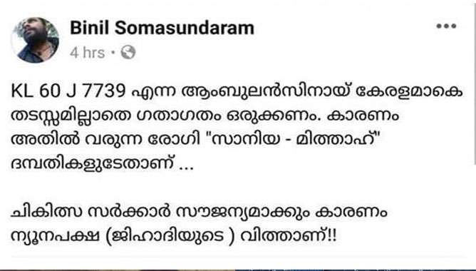 ‘കെ എല് 60 ജെ 7739 എന്ന ആംബുലന്സിനായ് കേരളമാകെ തടസ്സമില്ലാതെ ഗതാഗതം ഒരുക്കണം. കാരണം അതില് വരുന്ന രോഗി ‘സാനിയ-മിത്താഹ്’ ദമ്പതികളുടേതാണ്. ചികിത്സ സര്ക്കാര് സൗജന്യമാക്കും. കാരണം ന്യൂനപക്ഷ(ജിഹാദിയുടെ) വിത്താണ്’ ഇങ്ങനെയായിരുന്നു ബിനില് ഫേസ്ബുക്കില് കുറിച്ചത്.