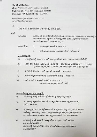വേടന്റെ പാട്ടൊഴിവാക്കാന്‍ പരാതി നല്‍കിയത് ബി.ജെ.പിയും സേവ് യൂണിവേഴ്‌സിറ്റി ഫോറവും; സിലബസുമായി മുന്നോട്ട് പോകുമെന്ന് റിപ്പോര്‍ട്ട്