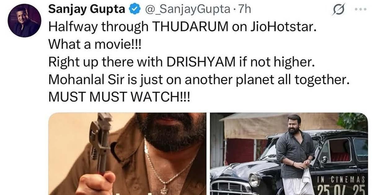 ഒ.ടി.ടി റിലീസിന് പിന്നാലെ ചിത്രത്തെ പ്രശംസിച്ച് പലരും രംഗത്തെത്തിയിരിക്കുകയാണ്. ബോളിവുഡ് സംവിധായകന് സഞ്ജയ് ഗുപ്ത എക്സില് പങ്കുവെച്ച കുറിപ്പാണ് ഇപ്പോള് സോഷ്യല് മീഡിയയില് വൈറല്. തുടരും സിനിമ പകുതിയോളം കണ്ടെന്ന് പറഞ്ഞുകൊണ്ടാണ് സഞ്ജയ് തന്റെ കുറിപ്പ് ആരംഭിക്കുന്നത്.