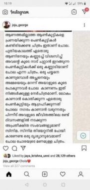 ‘ഒരു പയ്യനെ കാണുമ്പോള് അച്ഛനേയും അമ്മയേയും മറന്ന് അയാളുടെ കൂടെ പോകുന്ന പെണ്കുട്ടികള് ‘ (ജോജു പങ്കുവെച്ച പോസ്റ്റില് നിന്നും) ഒടുക്കം അര്ഹിക്കുന്നതും എത്തിച്ചേരേണ്ടതും ഇവിടേയാണ് എന്ന പിന്തിരിപ്പന് ചിന്തയാണ് ഇവിടെ വായിക്കാന് സാധിക്കുന്നത്.
