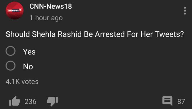 CNN News18 ran a poll on their YouTube Page calling for arrest of @Shehla_Rashid; Deleted it when they were questioned. Journalism in #NewIndia wants those critical of Govt to be arrested for an unverified tweet, while govt can keep propagating misinformation with no ramification pic.twitter.com/bsNL3pGmLG