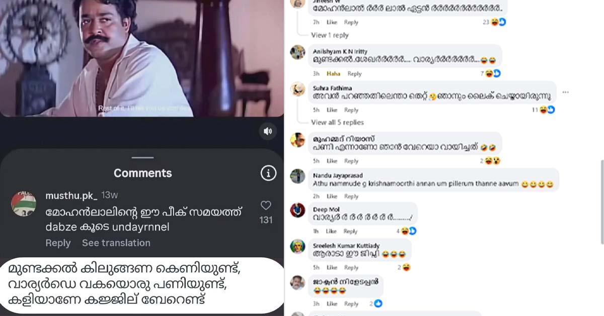 മോഹന്‍ലാലിന്റെ പഴയ സിനിമകളുടെ റീലുകളെല്ലാം പഴയതിനെക്കാള്‍ വീര്യത്തോടെ സോഷ്യല്‍ മീഡിയയില്‍ പ്രചരിക്കുകയാണ്. എന്നാല്‍ ഒരു റീലിനടിയില്‍ വന്ന കമന്റും അതിന് നല്‍കിയ മറുപടികളുമെല്ലാം ചിരിയുടെ മാലപ്പടക്കത്തിന് തിരി തെളിയിച്ചിരിക്കുകയാണ്. ‘മോഹന്‍ലാലിന്റെ പീക്ക് ടൈമില്‍ ഡബ്‌സി ഉണ്ടായിരുന്നെങ്കില്‍’ എന്ന കമന്റാണ് ചര്‍ച്ചകള്‍ക്ക് തുടക്കം കുറിച്ചത്.