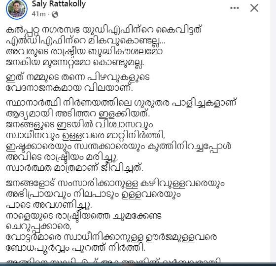 എല്.ഡി.എഫിന്റെ മികവുകൊണ്ടല്ല, യു.ഡി.എഫിന്റെ പിഴവുകൊണ്ടാണ് കല്പ്പറ്റ നഗരസഭ കൈവിട്ടതെന്ന് സാലി റാട്ടക്കൊല്ലി ഫേസ്ബുക്കില് കുറിച്ചു. എല്.ഡി.എഫിന്റെ വിജയത്തിന് കാരണമായത് അവരുടെ രാഷ്ട്രീയ ബുദ്ധികൗശലമോ, ജനകീയ മുന്നേറ്റമോ അല്ലെന്നും സാലി കൂട്ടിച്ചേര്ത്തു.