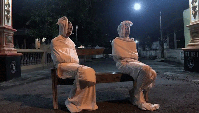 ഗ്രാമത്തിലെ ഒരു കൂട്ടം യുവാക്കളുടെ സംഘടന പൊലീസുമായി ചേര്ന്നാണ് ഇങ്ങനെയൊരു നീക്കം നടത്തിയത്. ഇന്ത്യോനേഷ്യയിലെ ഐതിഹ്യങ്ങളിലെ ഒരു കഥാപാത്രമായ പൊകൊങ് എന്ന പ്രേതകഥാപാത്രങ്ങളുടെ വേഷം ധരിച്ചാണ് ഇവര് തെരുവിലിറങ്ങിയത്.