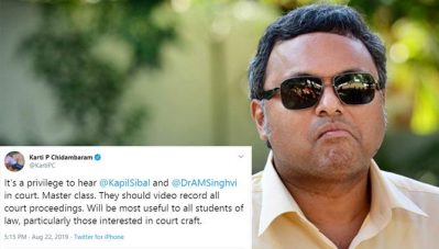 നേരത്തേ ചിദംബരത്തിനു വേണ്ടി മുതിര്ന്ന കോണ്ഗ്രസ് നേതാക്കള് കൂടിയായ അഭിഭാഷകര് കപില് സിബലും അഭിഷേക് മനു സിങ്വിയുമാണ് കോടതിയില് ഹാജരായത്. ഇവരുടെ വാദങ്ങളെ ‘മാസ്റ്റര് ക്ലാസ്സ്’ എന്നായിരുന്നു കാര്ത്തി വിശേഷിപ്പിച്ചത്.