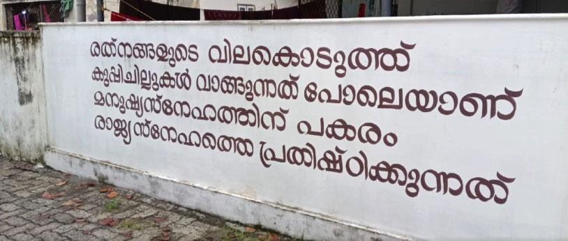 ‘രത്‌നങ്ങളുടെ വിലകൊടുത്ത് കുപ്പിച്ചില്ലുകള്‍ വാങ്ങുന്നത് പോലെയാണ് മനുഷ്യസ്‌നേഹത്തിന് പകരം രാജ്യസ്‌നേഹത്തെ പ്രതിഷ്ഠിക്കുന്നത്,’ എന്നാണ് മതിലില്‍ എഴുതിയിരിക്കുന്നത്.