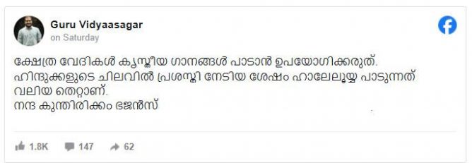 ക്ഷേത്രവേദികളെ ക്രിസ്തീയ ഗാനങ്ങള് ആലപിക്കാന് ഉപയോഗിക്കുന്നത് അംഗീകരിക്കാനാവില്ലെന്ന് വിദ്യാസാഗര് ഗുരുമൂര്ത്തി ഫെയ്സ്ബുക്കില് എഴുതി.