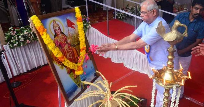 ഭാരതാംബയെന്ന് വിളിക്കപ്പെടുന്ന കാവിക്കൊടിയേന്തിയ സത്രീയുടെ ചിത്രത്തിന് മുന്നില് കേരള ഗവര്ണര് രാജേന്ദ്ര ആര്ലേക്കര്