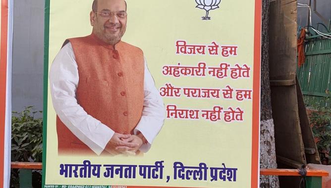 ഇതിനിടെ ബി.ജെ.പിയുടെ ദല്ഹി ഓഫീസിന് മുന്പില് പുതിയ പോസ്റ്റര് ഉയര്ത്തിയിരിക്കുകയാണ് ബി.ജെ.പി. കേന്ദ്ര ആഭ്യന്തരമന്ത്രി അമിത് ഷായുടെ ചിത്രത്തിനൊപ്പം തോല്വിയില് ഞങ്ങള് അസ്വസ്ഥരാകില്ല എന്ന വാചകമാണ് ബി.ജെ.പി കുറിച്ചിരിക്കുന്നത്.