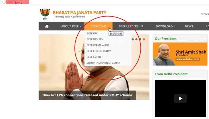 വെബ്സൈറ്റിന്റെ ഹോം പേജില് ബി.ജെ.പി എന്നതില് മാറ്റം വരുത്തി പകരം ബീഫ് എന്നാക്കി യിട്ടുണ്ട്.