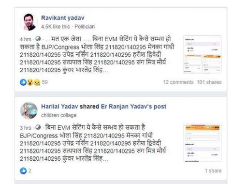 ന്യൂദല്ഹി: കഴിഞ്ഞ ദിവസങ്ങളില് സോഷ്യല് മീഡിയയില് വൈറലായ പോസ്റ്റാണ് യു.പിയില് ഏഴ് മണ്ഡലങ്ങളില് ബി.ജെ.പി സ്ഥാനാര്ത്ഥികള്ക്ക് 211820 വോട്ടുകളും കോണ്ഗ്രസ് സ്ഥാനാര്ത്ഥികള്ക്ക് 1,40,295 വോട്ടുകളുമാണ് ലഭിച്ചതെന്ന്. ‘ഇ.വി.എം അട്ടിമറിയിലൂടെയല്ലാതെ എങ്ങനെ ഇത് സാധ്യമാകും’? എന്ന ചോദ്യമുയര്ത്തിയായിരുന്നു ഈ പോസ്റ്റ് സോഷ്യല് മീഡിയയില് പ്രചരിച്ചത്.