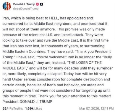 ഇറാന് ക്ഷമ പറഞ്ഞ് അയല്ക്കാരോട് കീഴടങ്ങി. ഇനി അവര്ക്കെതിരെയും വെടിയുതിര്ക്കാന് ധൈര്യപ്പെടില്ലെന്നും ട്രംപ് പറഞ്ഞു. ഇസ്രഈലിന്റെയും യു.എസിന്റെയും നിരന്തരമായ ആക്രമണം കാരണം മാത്രമാണ് ഇറാന് ഇത്തരത്തിലൊരു വാക്ക് നല്കിയതെന്നും ട്രംപ് അവകാശപ്പെട്ടു.