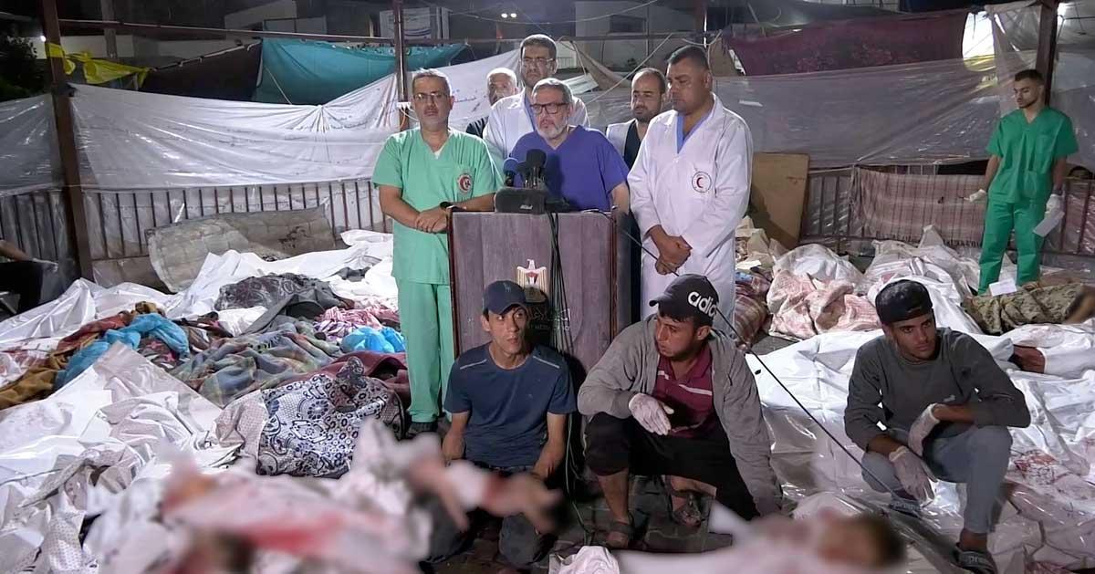 ആക്രമണത്തിന് മണിക്കൂറുകള്ക്ക് ശേഷം, പരിക്കേറ്റവരെ ചികിത്സിച്ച ഗസ്സാന് അബു ഉള്പ്പെടെയുള്ള ഡോക്ടര്മാര് അടുത്തുള്ള അല്-ഷിഫ ആശുപത്രിയില് ഒരു വാര്ത്താ സമ്മേളനം നടത്തി, സ്ഫോടനത്തില് കൊല്ലപ്പെട്ടവരുടെ മൃതദേഹങ്ങള്ക്കരികെ നിന്നുകൊണ്ട് തന്നെ.