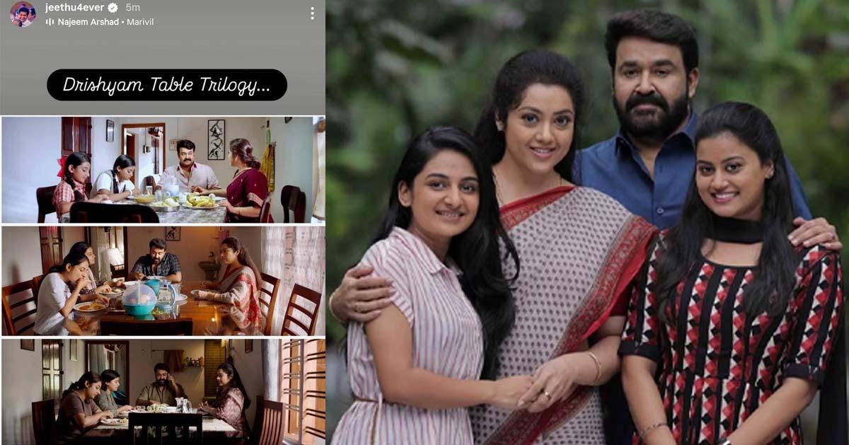 പിന്നാലെ മൂന്ന് ഭാഗങ്ങളിലെയും ഫോട്ടോ ഒരുമിച്ച് വെച്ചുകൊണ്ടുള്ള കൊളാഷ് സമൂഹമാധ്യമങ്ങളില് പ്രചരിക്കുകയാണ്. സംവിധായകന് ജീത്തു ജോസഫ് ഈ ചിത്രം തന്റെ ഇന്സ്റ്റഗ്രാം സ്റ്റോറിയായി പങ്കുവെക്കുകയും ചെയ്തു. പടത്തില് ട്വിസ്റ്റ് ഇല്ലെങ്കിലും ഇങ്ങനെയൊരു ഷോട്ട് എന്തായാലും ഉണ്ടാകുമെന്ന തരത്തില് പല കമന്റുകളും പിന്നാലെ വരുന്നുണ്ട്.