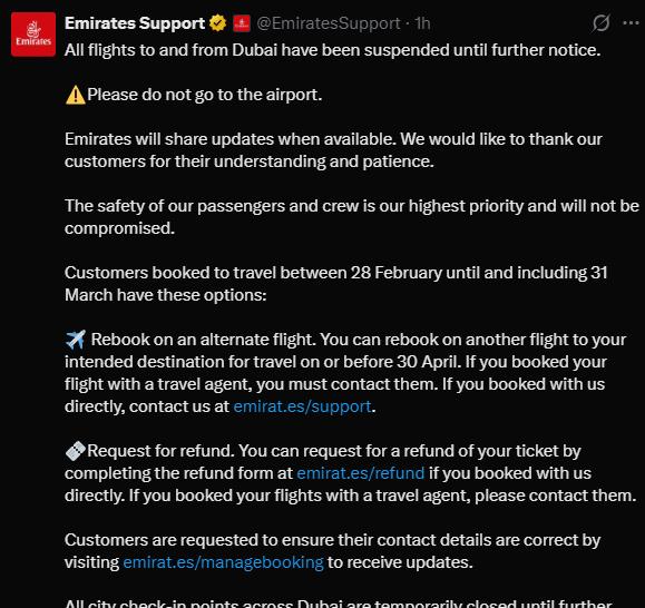തുടര്ച്ചയായി സ്ഫോടനങ്ങള് ഉണ്ടാകുന്ന പശ്ചാത്തലത്തിലാണ് തീരുമാനം. നിര്ത്തിവെച്ച സര്വീസുകള് ഉടന് പുനരാരംഭിക്കുമെന്നും എമിറേറ്റ്സ് അറിയിച്ചു.