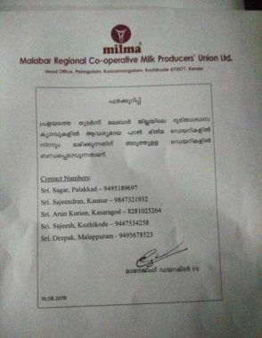 പാലക്കാട്, കണ്ണൂര്, കാസര്കോട്, കോഴിക്കോട്, മലപ്പുറം ജില്ലകളിലാണ് സൗജന്യമായി പാല് വിതരണം ചെയ്യുന്നത്. ഔദ്യോഗികമായി സമീപിച്ചാല് മാത്രമേ പാല് ലഭിക്കൂ എന്നാണ് ഇവര് അറിയിച്ചിരിക്കുന്നത്. ക്യാമ്പുകളിലേക്കാണ് പാലിന്റെ ആവശ്യമെന്നും അത്രയും പാലുകള് ആവശ്യമുണ്ടെന്നുമുള്ള കൃത്യമായ കണക്കുകള് കൊണ്ട് മാത്രമേ മില്മ പാല് വിതരണം നടത്തൂവെന്നും അധികൃതര് അറിയിച്ചിട്ടുണ്ട്.