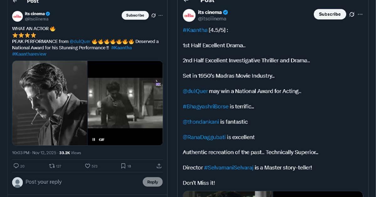 സിനിമാപ്രേമികള് ഏറെ പ്രതീക്ഷയോടെ കാത്തിരിക്കുന്ന ചിത്രമാണ് കാന്താ. റിലീസിന് രണ്ട് ദിവസം മുമ്പ് തമിഴ്നാട്ടിലും ആന്ധ്രയിലും ചിത്രത്തിന്റെ പ്രീമിയര് ഷോ സംഘടിപ്പിച്ചിരുന്നു. അതിഗംഭീര പ്രതികരണങ്ങളാണ് പ്രീമിയറിന് പിന്നാലെ കാന്താക്ക് ലഭിക്കുന്നത്. ഈ വര്ഷത്തെ ഏറ്റവും മികച്ച സിനിമകളുടെ പട്ടികയില് കാന്തായും ഉള്പ്പെടുമെന്നാണ് പലരും അഭിപ്രായപ്പെടുന്നത്.