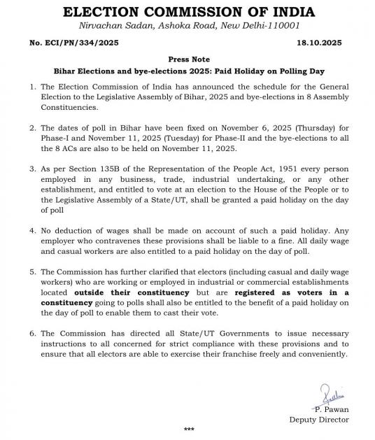 പാട്ന: ബീഹാര് നിയമസഭാ തെരഞ്ഞെടുപ്പില് നിര്ണായക ഇടപെടലുമായി തെരഞ്ഞെടുപ്പ് കമ്മീഷന്. പോളിങ് ദിവസങ്ങളില് സംസ്ഥാനത്തെ വോട്ടര്മാര്ക്ക് ശമ്പളത്തോട് കൂടിയ അവധി നല്കണമെന്ന് കമ്മീഷന് ഉത്തരവിട്ടു.